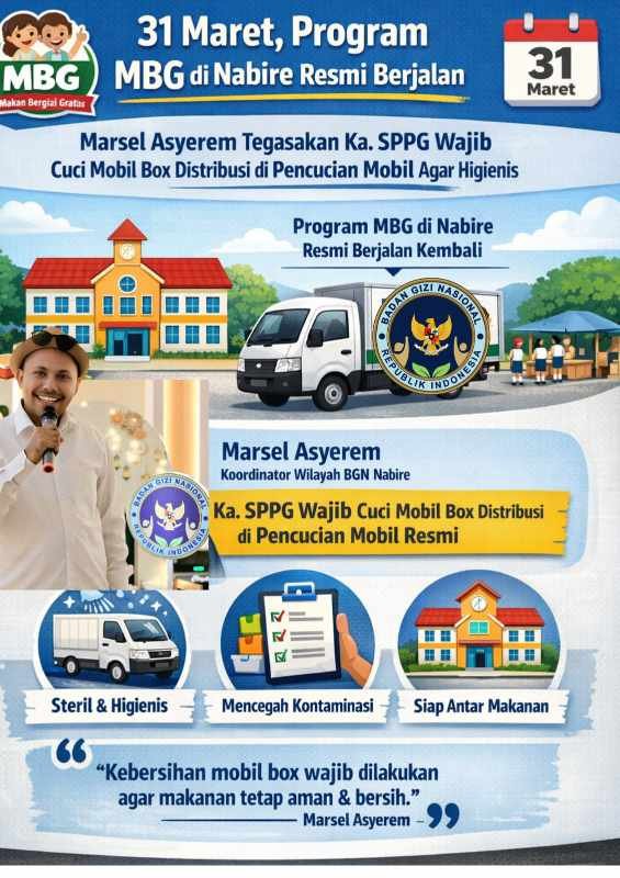 Marsel menekankan bahwa mobil box distribusi MBG harus dicuci di tempat pencucian mobil resmi guna menjamin kebersihan dan kelayakan penggunaan. Langkah ini dinilai penting untuk mencegah potensi kontaminasi yang dapat memengaruhi kualitas makanan yang didistribusikan kepada peserta didik.