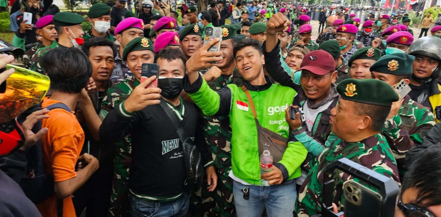 Demonstran yang terdiri dari warga dan pengemudi ojek daring, diminta untuk menahan diri dan menjaga ketertiban. Upaya ini, menjadi wujud kehadiran TNI dalam mendukung terciptanya keamanan, serta kenyamanan bersama.