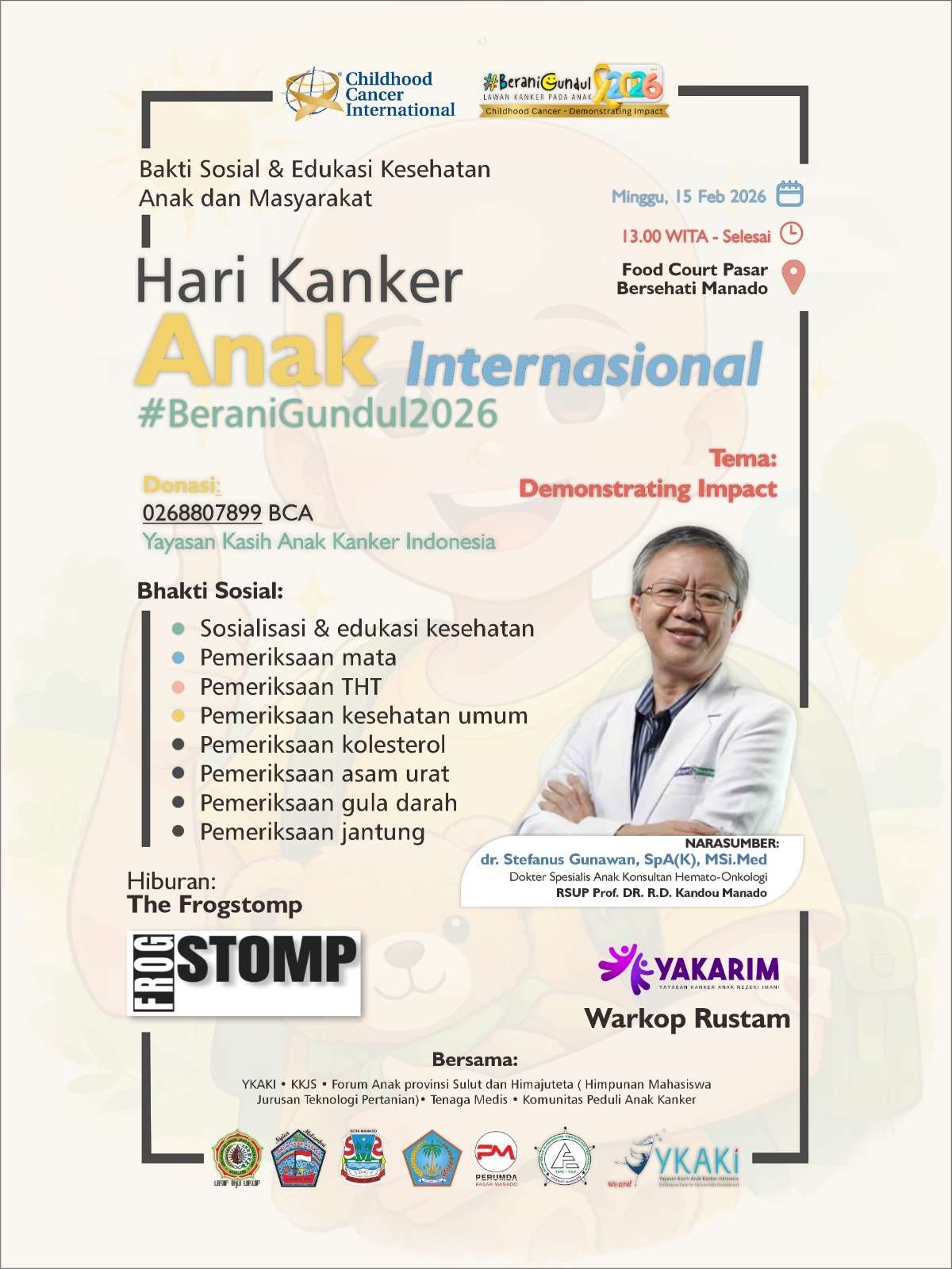 MEDIA MATARAKYATNEWS || MANADO – Dalam rangka meningkatkan kesadaran dan dukungan untuk anak-anak penderita kanker, sebuah kegiatan bakti sosial dan pemeriksaan kesehatan gratis diadakan pada Minggu, 15 februari 2026 di pasar Bersehati Kota Manado