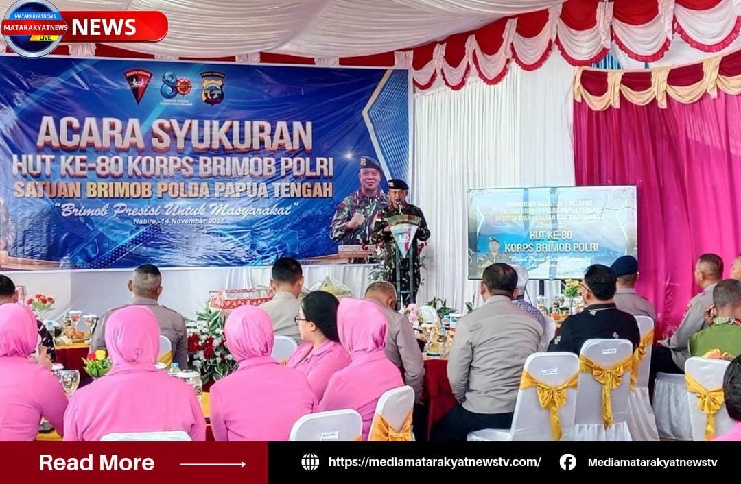 MEDIA MATARAKYATNEWS || Nabire, Papua Tengah – Satuan Brimob Polda Papua Tengah menggelar Acara Syukuran Hari Ulang Tahun (HUT) ke-80 Korps Brimob Polri Tahun 2025 pada Jumat, 14 November 2025, bertempat di Mako Brimob Sat Brimob Polda Papua Tengah, Distrik Teluk Kimi, Kabupaten Nabire. Kegiatan berlangsung mulai pukul 09.30 hingga 12.10 WIT dengan mengusung tema “Brimob Presisi Untuk Masyarakat.” ujaranya.