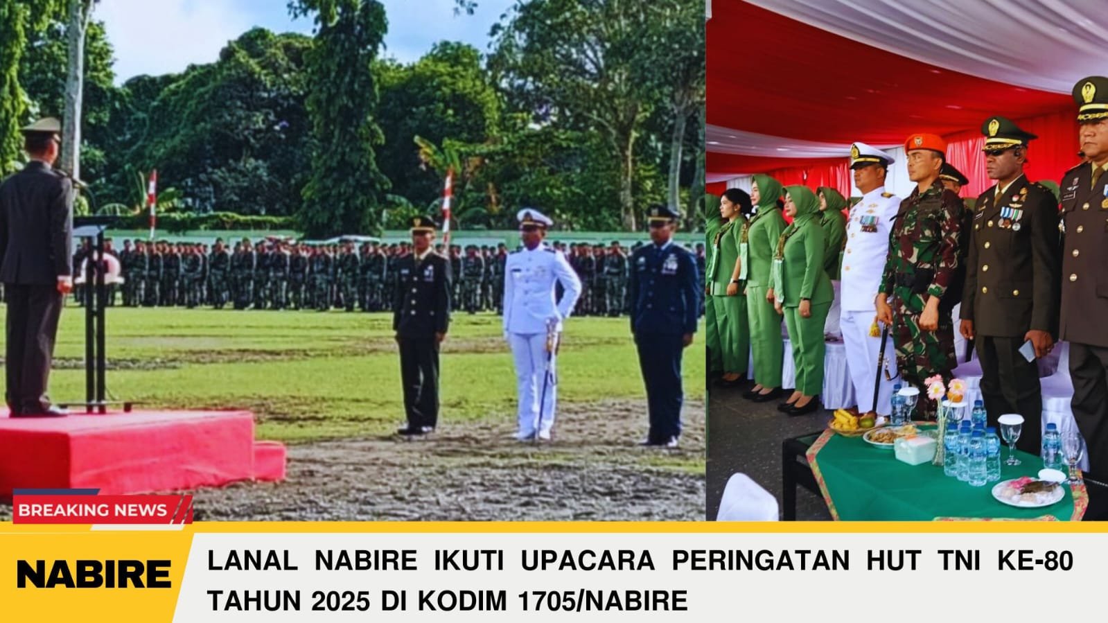 MEDIA MATARAKYATNEWS || NABIRE, PAPUA TENGAH – Dalam rangka memperingati Hari Ulang Tahun ke-80 Tentara Nasional Indonesia (TNI), Lanal Nabire turut serta dalam pelaksanaan Upacara Peringatan HUT TNI ke-80 Tahun 2025, yang digelar di Lapangan Sapta Marga Kodim 1705 Nabire, Jl. Jenderal Ahmad Yani, Kelurahan Karang Tumaritis, Distrik Nabire, Kabupaten Nabire, Provinsi Papua Tengah, pada Minggu 5 Oktober 2025.
