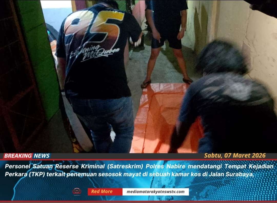 Media Matarakyatnews |Nabire Papua Tengah – Personel Satuan Reserse Kriminal (Satreskrim) Polres Nabire mendatangi Tempat Kejadian Perkara (TKP) terkait penemuan sesosok mayat di sebuah kamar kos di Jalan Surabaya, Kelurahan Karang Mulia, Distrik Nabire, Kabupaten Nabire, Provinsi Papua Tengah, Sabtu (07/03/2026) malam.