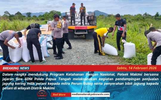 MEDIA MATARAKYATNEWS |Nabire – Dalam rangka mendukung Program Ketahanan Pangan Nasional, Polsek Makimi bersama jajaran Biro SDM Polda Papua Tengah melaksanakan kegiatan pendampingan penjualan jagung kering milik petani kepada mitra Perum Bulog serta penyerahan bibit jagung kepada petani di wilayah Distrik Makimi, Kabupaten Nabire, Sabtu (14/02/2026).