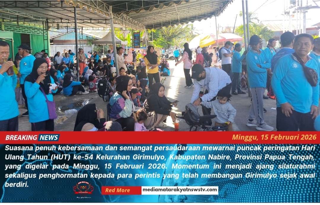 MEDIA MATARAKYATNEWS|Girimulyo, Nabire – Suasana penuh kebersamaan dan semangat persaudaraan mewarnai puncak peringatan Hari Ulang Tahun (HUT) ke-54 Kelurahan Girimulyo, Kabupaten Nabire, Provinsi Papua Tengah, yang digelar pada Minggu, 15 Februari 2026. Momentum ini menjadi ajang silaturahmi sekaligus penghormatan kepada para perintis yang telah membangun Girimulyo sejak awal berdiri.
