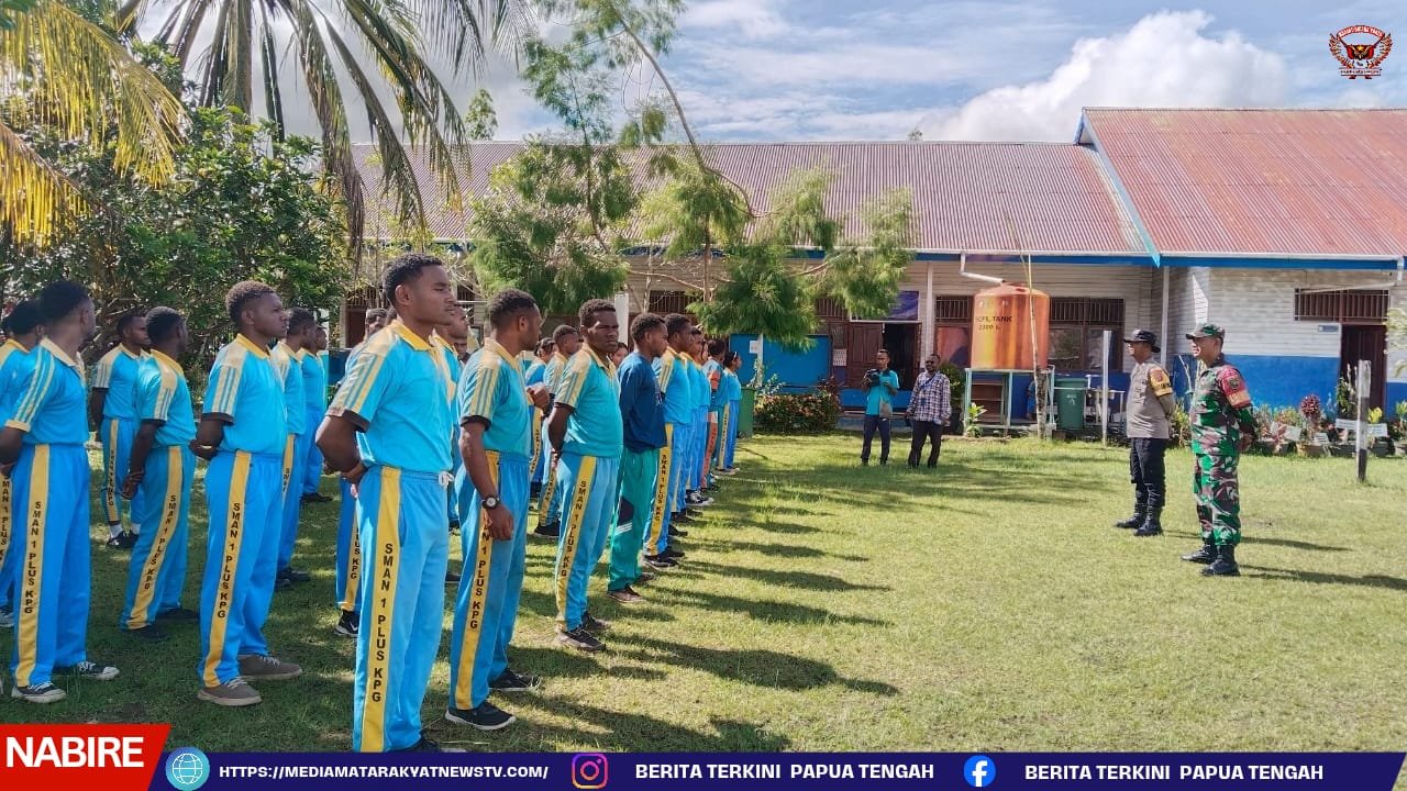 MEDIA MATARAKYATNEWS || Nabire – Papua Tengah – Wujud sinergitas antara TNI dan POLRI ditunjukkan melalui kegiatan pembinaan generasi muda, dengan memberikan materi Peraturan Baris Berbaris (PBB) serta Latihan Dasar Kepemimpinan (LDK) kepada para pelajar SMA N KPG Bumi Raya Kabupaten Nabire, Sabtu (27/9/2025).